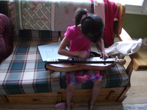 as of 7\1\2009 Peggy and I learned to play dulcimers and I learned how to build them. This is Kara-linn Hynes my granddaughter she liked to play my dulcimer although dhe had a hard time reaching the chords so I built this 19 inch long dulcimer for her she now has a full sized one